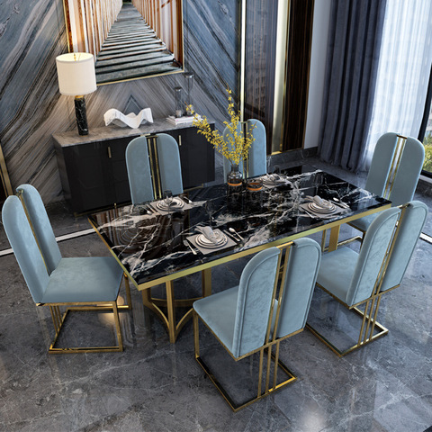 Light Luxury Modern Dining Room Furniture Stainless Steel Marble Dining Table Rectangular Gold Plated Dining Table and Chairs